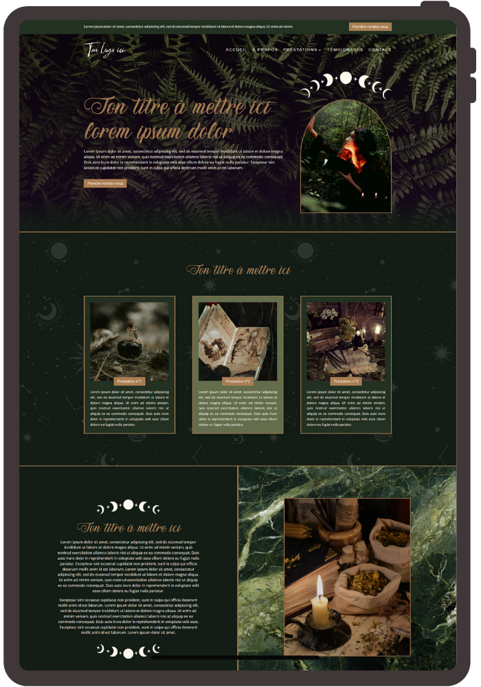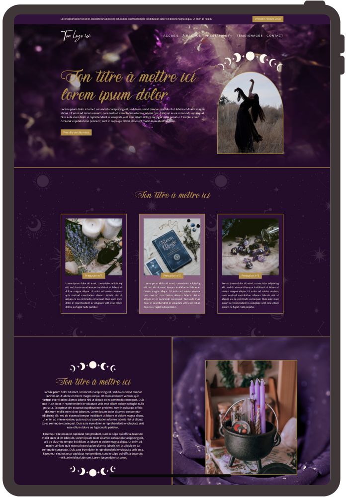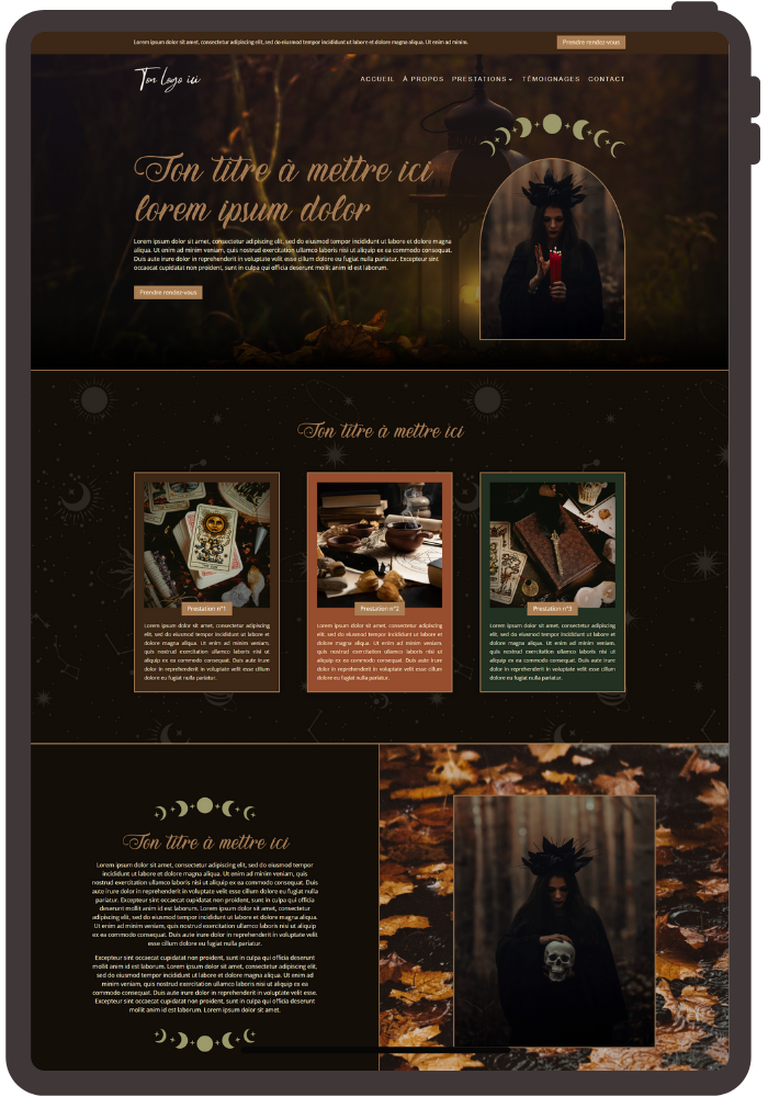 Avec Arcania, ton site devient un véritable portail vers ton univers magique. Pensé pour les praticiennes qui évoluent dans les arts ésotériques, ce template plonge instantanément tes visiteurs dans une ambiance mystique et envoûtante.