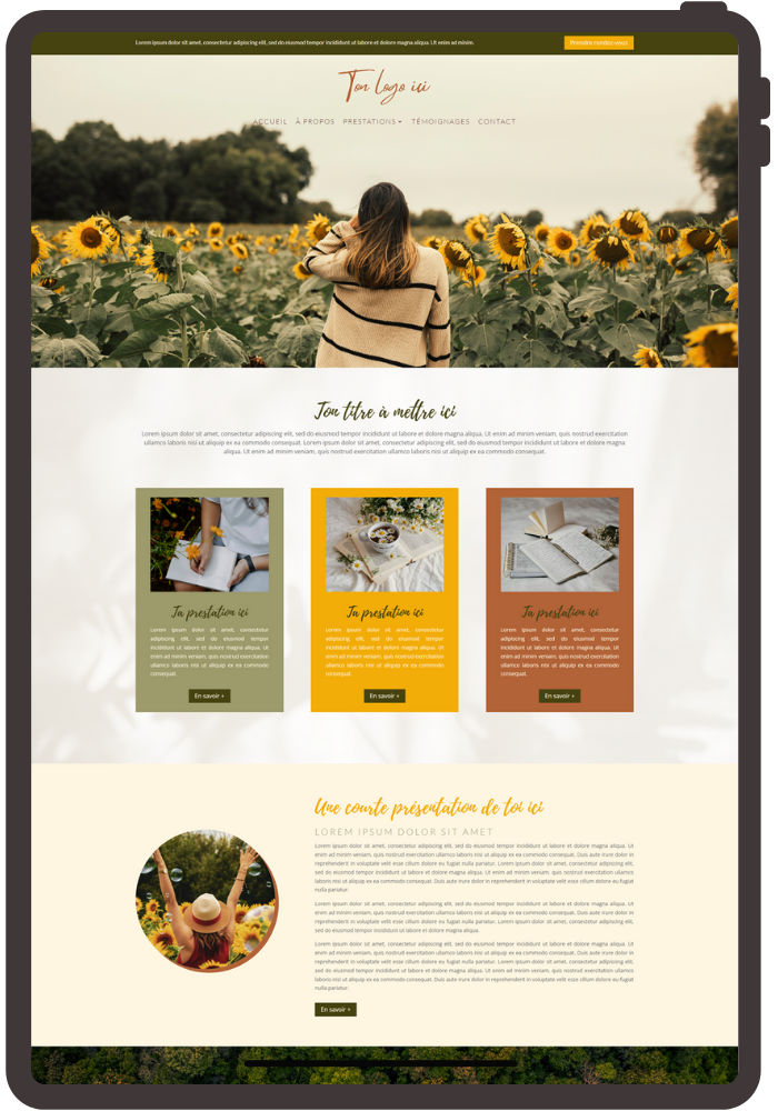 Chaque section est conçue pour valoriser ton approche, présenter tes services avec clarté et permettre à ton audience de ressentir l’énergie positive que tu transmets.
